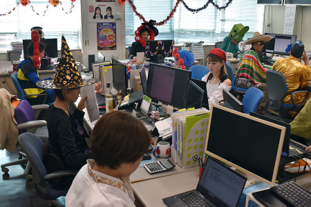 10月中に鳥取砂丘周辺で行われるハロウィーンイベントを盛り上げるため、鳥取県庁の職員が仮装姿で勤務した。イベントのPRを担う広報課の職員が、世界各国の民族衣装など、思い思いの仮装を披露=1日 【時事通信社】