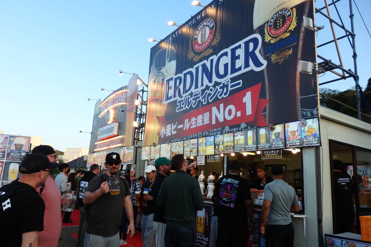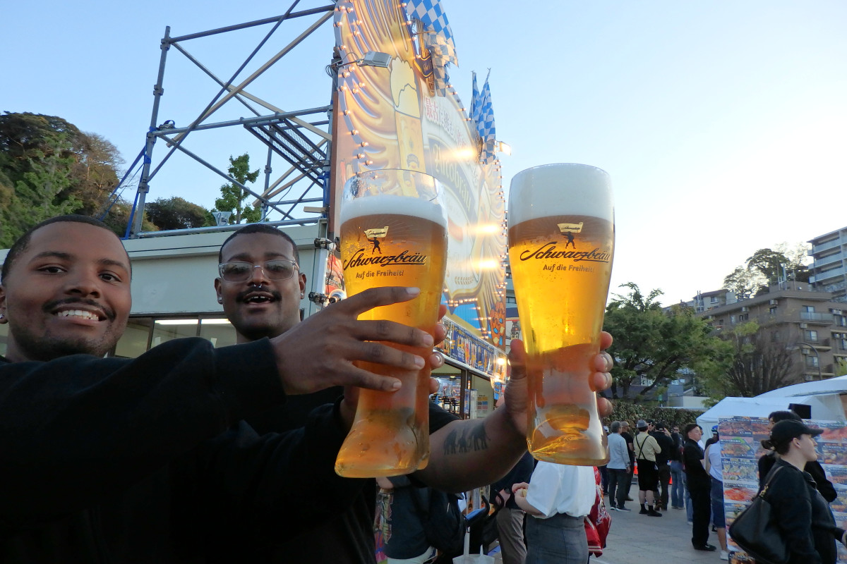 大きなビールジョッキを手に談笑するアメリカ人グループも