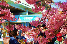 「昨年より開花が早まり、駅前の桜はほぼ満開。小松ヶ池公園にかけての線路沿いの桜は八分咲き」(三浦市観光協会)だという。河津桜は開花時期が早く、大きなピンク色の花が特徴。カンヒザクラと早咲きオオシマザクラの自然交配種と推定されている。